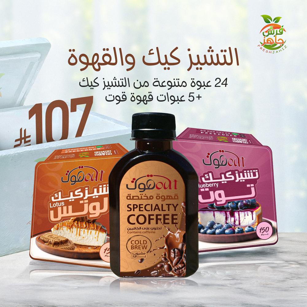 🍰☕ كرتون التشيز كيك والقهوة – 24 قطعة + 5 عبوات قهوة قوت | فرش جاهز